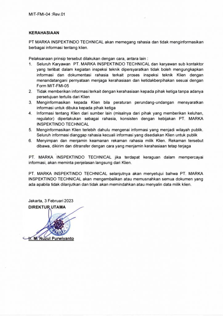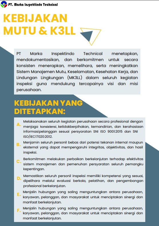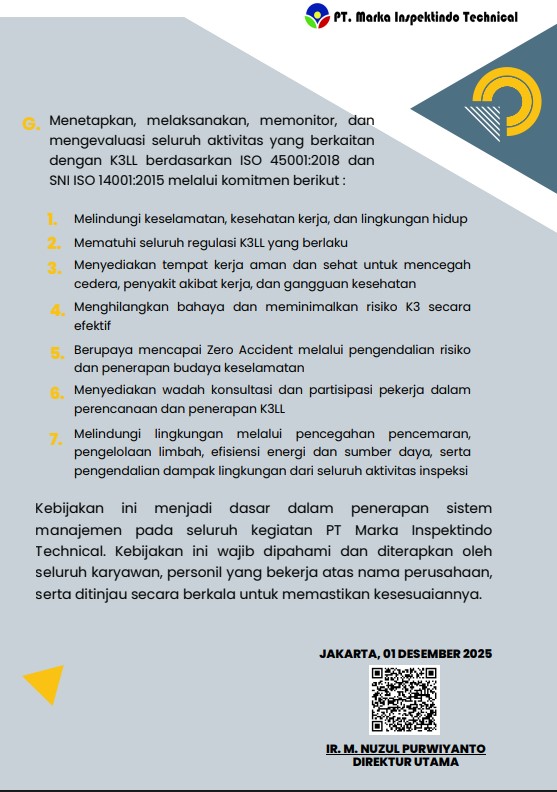 PT Marka Inspektindo Technical, established in September 1995, is a leading inspection and certification company specializing in the oil & gas sector and other related industries. With over 30 years of experience, we offer technical inspection and certification services, supported by a team of highly qualified professionals trained to meet both National and International standards.
